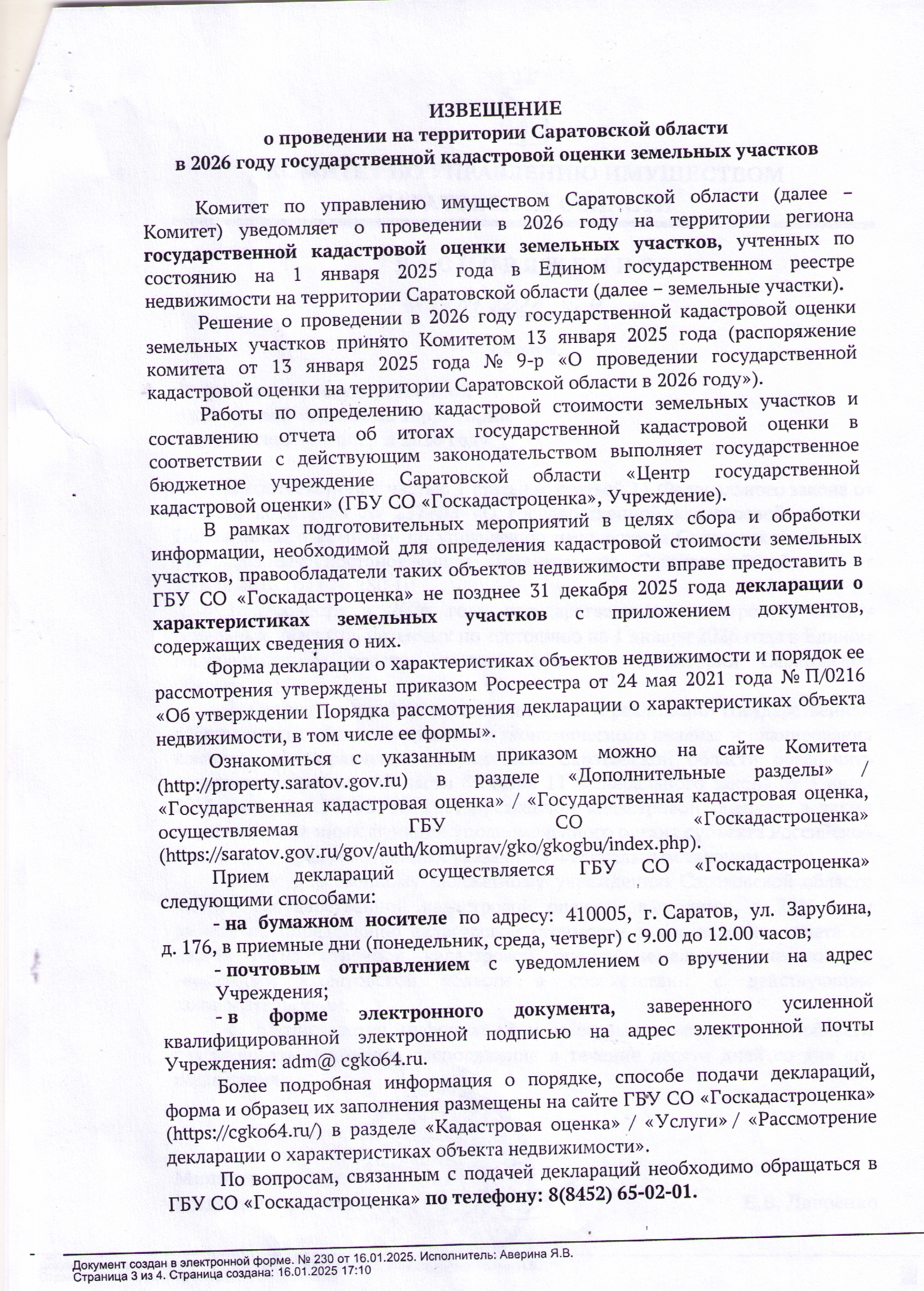 Извещение о проведении на территории Саратовской области в 2026 году государственной кадастровой оценки земельных участков (посмотреть)